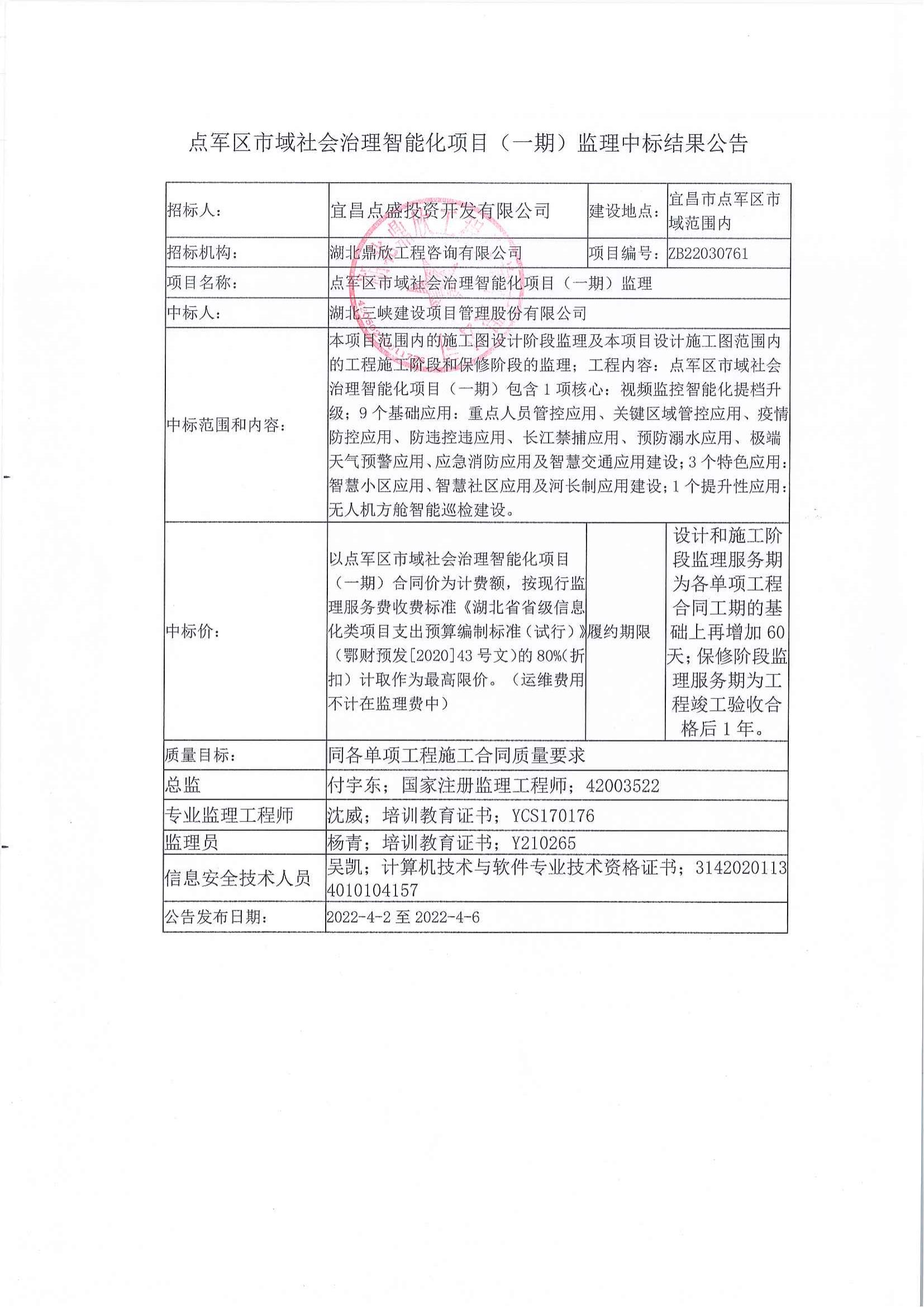點軍區(qū)市域社會治理智能化項目(一期)?監(jiān)理中標(biāo)結(jié)果公告