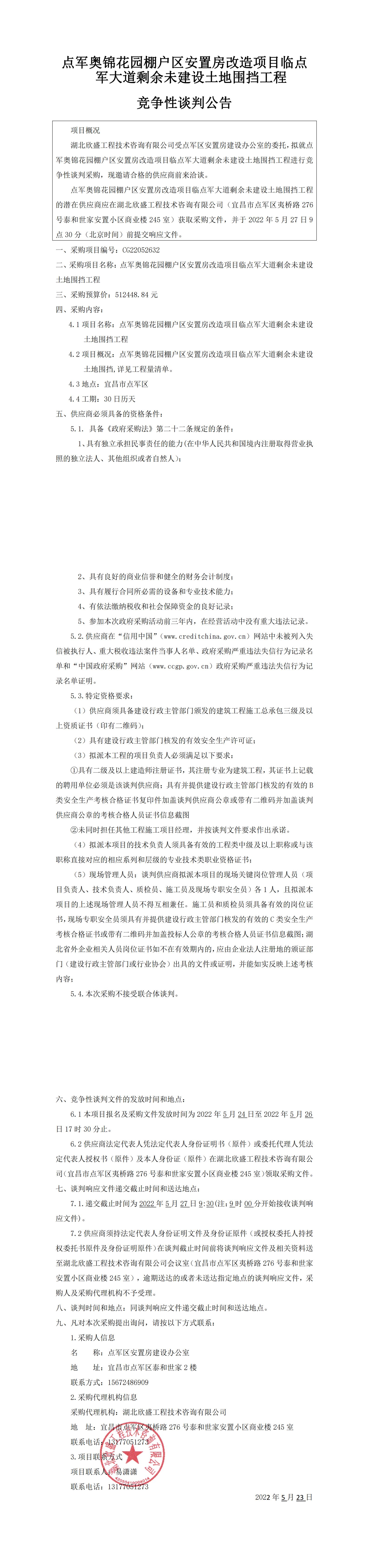 點(diǎn)軍奧錦花園棚戶區(qū)安置房改造項(xiàng)目臨點(diǎn)軍大道剩余未建設(shè)土地圍擋工程競爭性談判公告