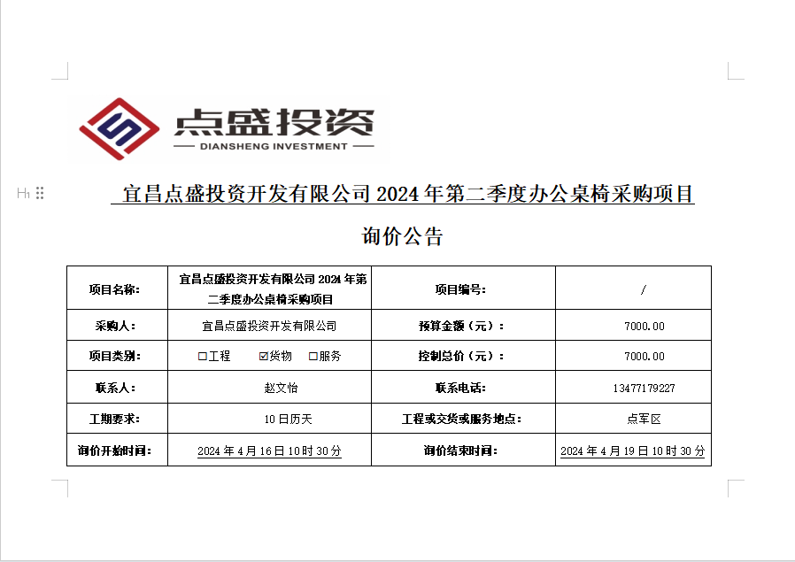 宜昌點盛投資開發(fā)有限公司2024年第二季度辦公桌椅采購項目 詢價公告
