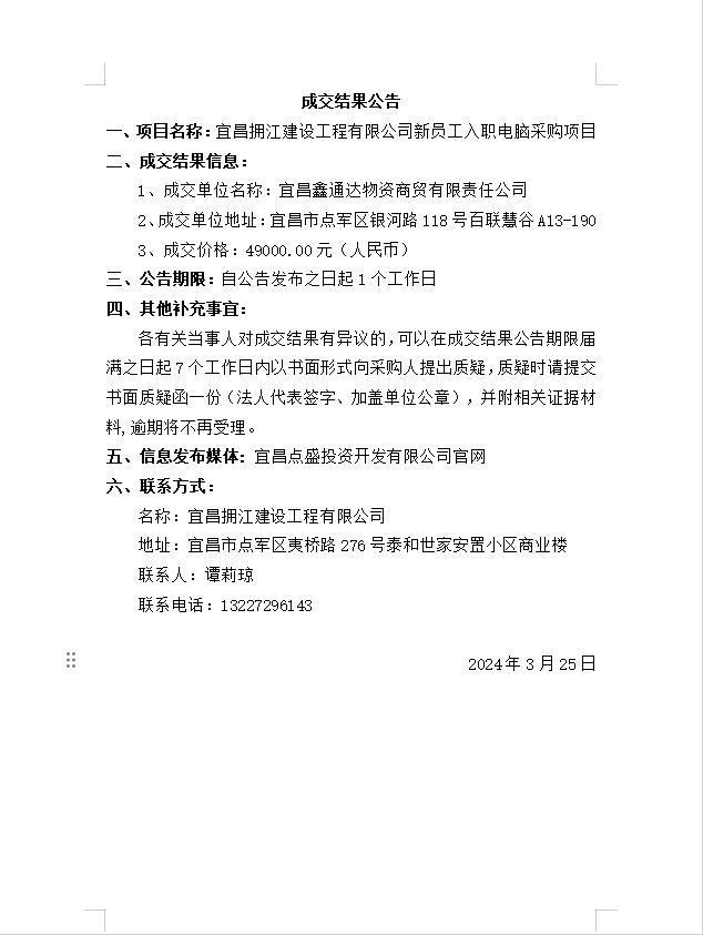 宜昌擁江建設(shè)工程有限公司新員工入職電腦采購項目成交公告
