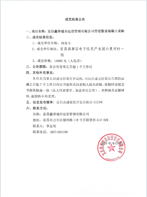 管道敷設(shè)混凝土采購項(xiàng)目成交公告