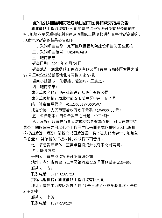 點(diǎn)軍區(qū)聯(lián)棚福利院建設(shè)項(xiàng)目施工圖復(fù)核成交結(jié)果公告