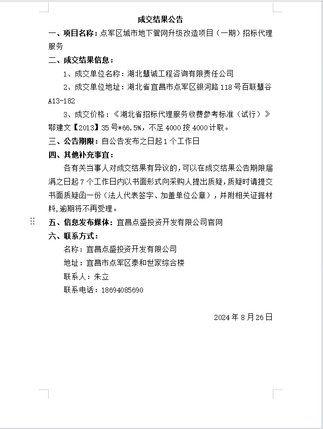 點(diǎn)軍區(qū)城市地下管網(wǎng)升級改造項(xiàng)目(一期)招標(biāo)代理服務(wù)成交公告