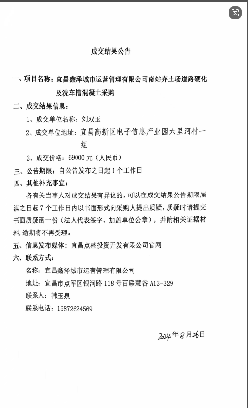 宜昌鑫澤城市運(yùn)營管理有限公司南站棄土場道路硬化及洗車槽混凝土采購項(xiàng)目成交公告