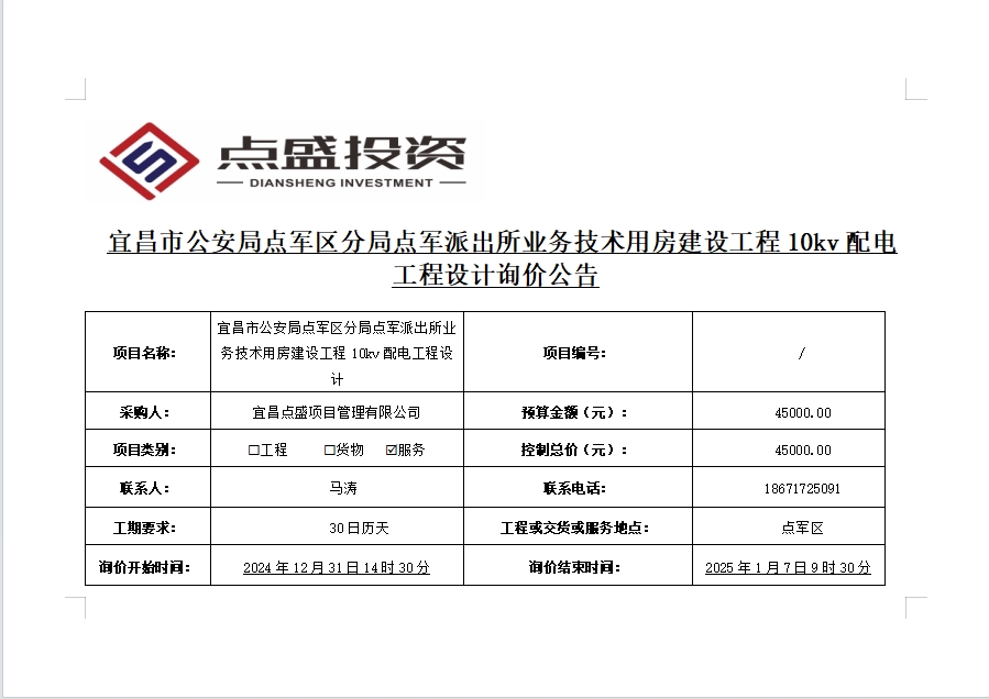 宜昌市公安局點(diǎn)軍區(qū)分局點(diǎn)軍派出所業(yè)務(wù)技術(shù)用房建設(shè)工程10kv配電工程設(shè)計(jì)詢價(jià)公告