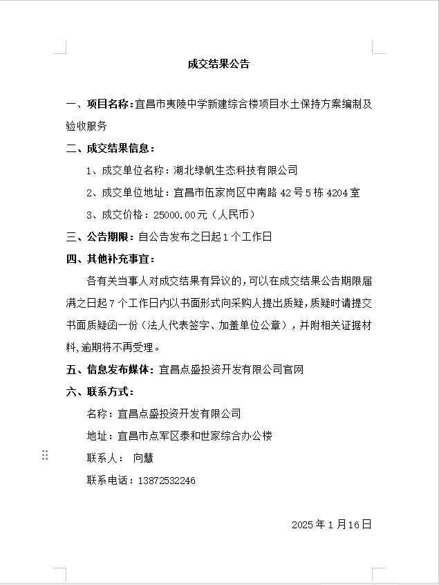 宜昌市夷陵中學(xué)新建綜合樓項(xiàng)目水土保持方案編制及驗(yàn)收服務(wù)成交公告