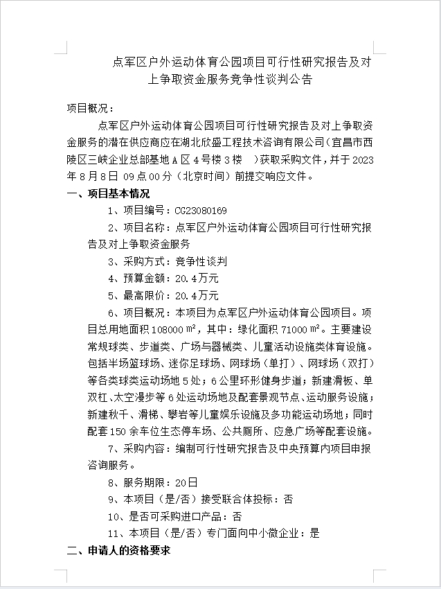 點(diǎn)軍區(qū)戶外運(yùn)動(dòng)體育公園項(xiàng)目可行性研究報(bào)告及對上爭取資金服務(wù)談判公告